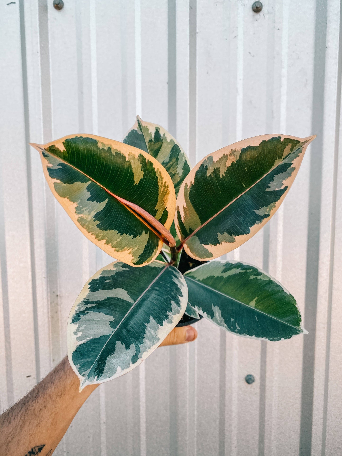 This stunning tree features large, glossy leaves with beautiful cream and green variegation, perfect for making a statement in your home.