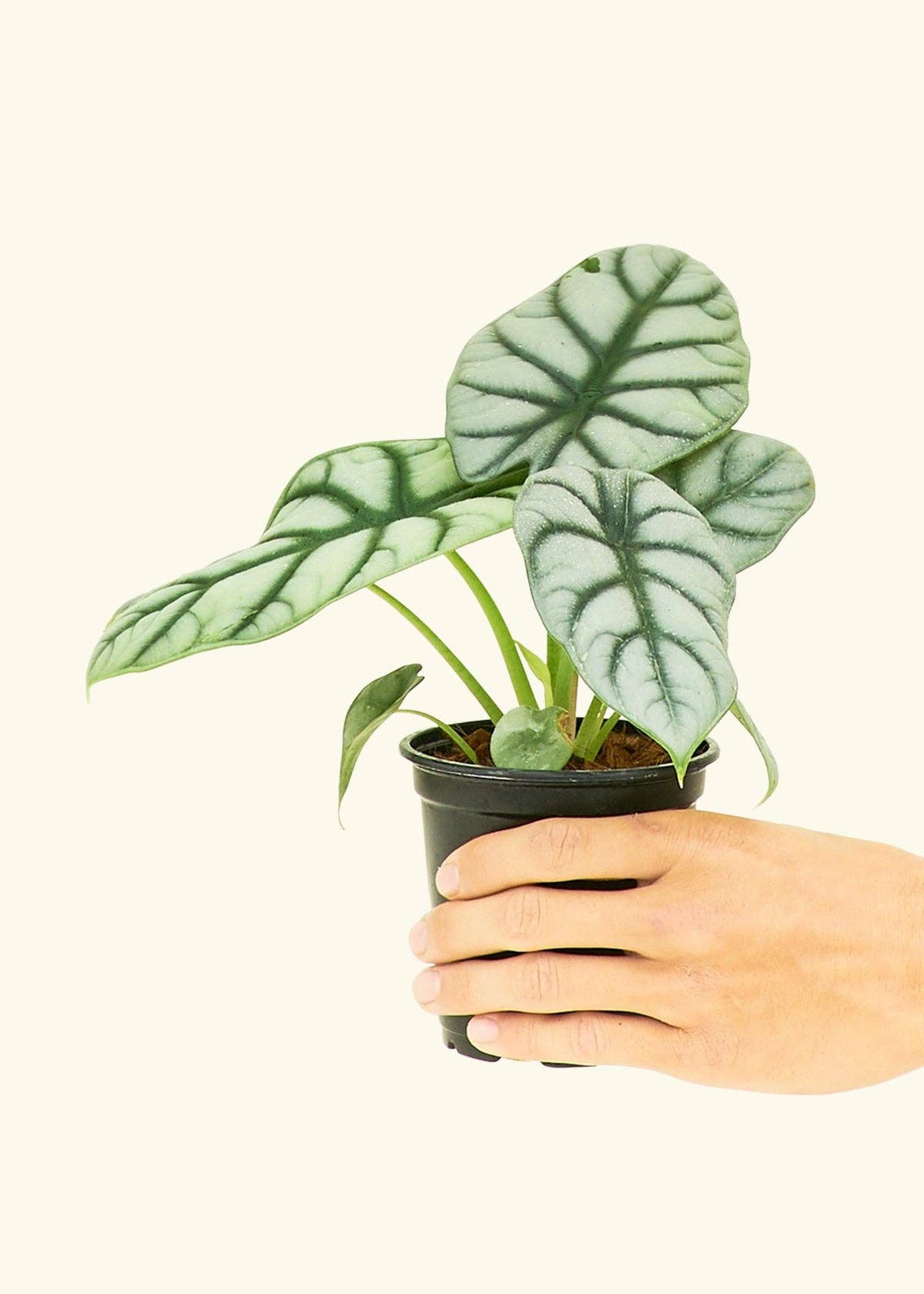 Alocasia baginda Each plant arrives rooted in a nursery pot.