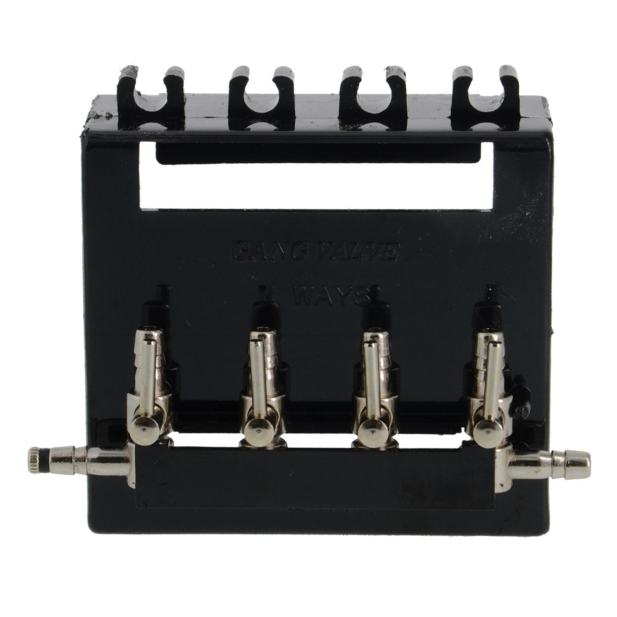 The Ista Metal Air Valves (4 Outlet) allow you to control up to 4 different airlines from your air pump. Quickly and easily attach this handy device to the frame of your aquarium and streamline your air hose setup. With a control knob available for each outlet, you can adjust the pressure on each air tube individually. Customize the use of your air stones, bubbles, air-driven decorations, or any other air pump powered device. 3" x 1.25" x 3"