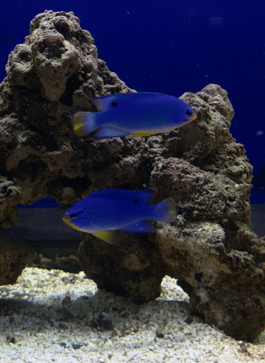 The Yellow-Tailed Blue Damsel is a striking freshwater fish prized for its vibrant coloration and active behavior in established aquariums. Males display brilliant blue bodies with distinctive yellow tail markings, while females exhibit more subdued coloring. These damselfish thrive in well-maintained tanks with plenty of hiding spaces among rocks and vegetation. They're relatively hardy and adaptable to various water conditions, making them suitable for intermediate aquarists. Best kept singly or in pairs, as they can display territorial aggression toward conspecifics. Provide stable water parameters and moderate water flow for optimal health and color expression.